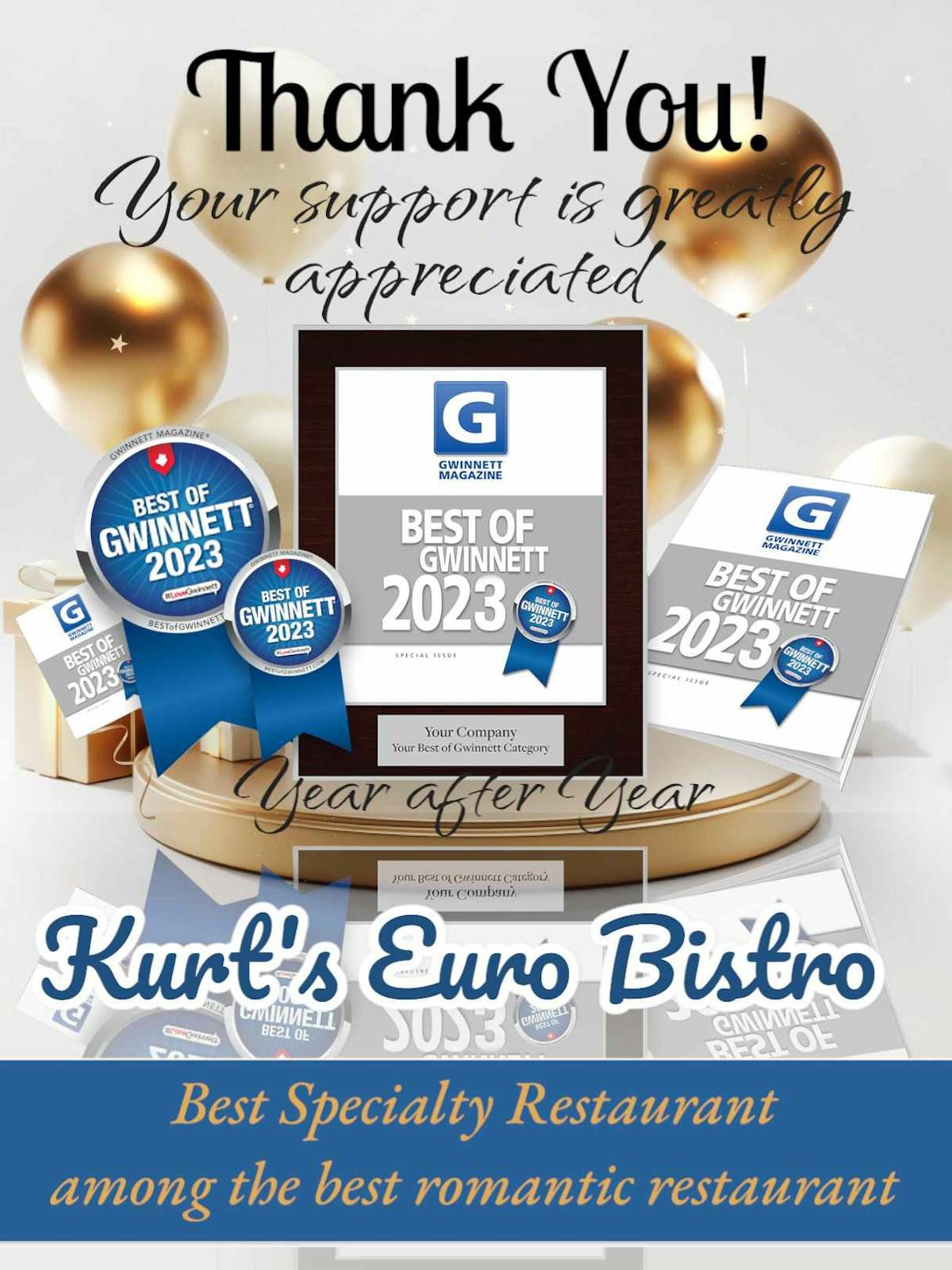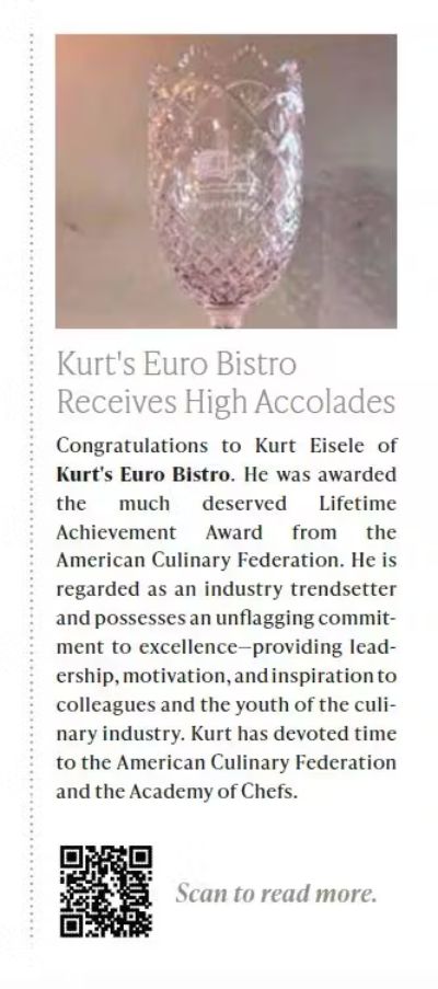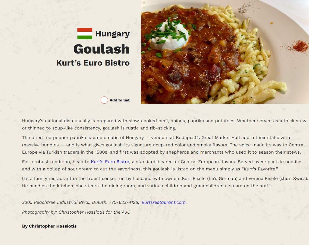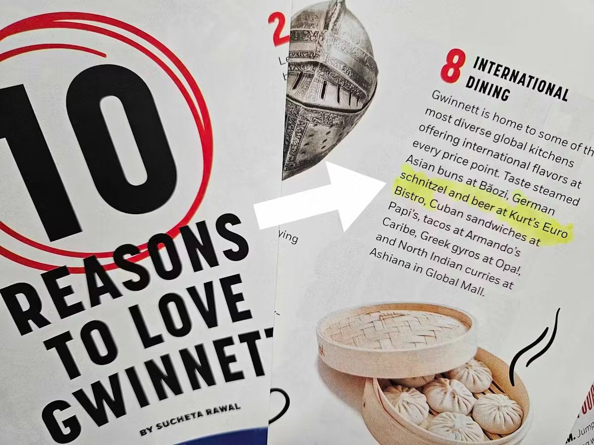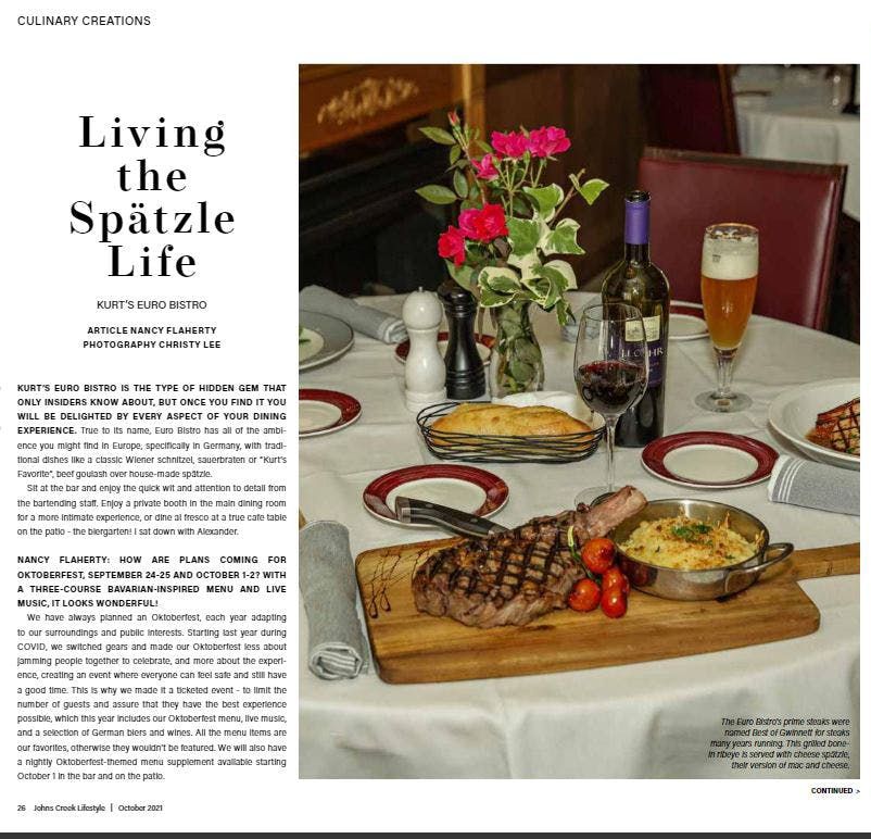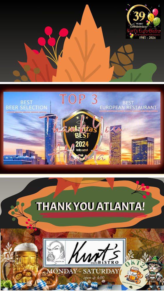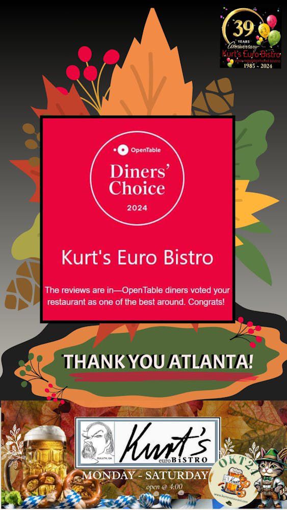 PressKURT'S EURO BISTRORestaurantjiWe just had another fabulous dinner at Kurt's. We have eaten here for many decades and the food is always outstanding, and the service is top-notch, which makes the experience amazing. I've never eaten anything here that wasn't fantastic.RESTAURANTJI.COMRESTAURANTJI«Loved every thing we ate. The waiter was cool and prompt and very good looking. Always a plus Atmosphere was nice n just what we needed tonight»VOTE FOR US8 German Restaurants In Georgia You Have To Try At Least Once— Daily WiseDuluth Restaurant Honors Late Founder with Two-Week Culinary Tribute and Silent Auction— Insider ContributorDuluth Restaurant Honors Late Founder with Special Culinary Tribute and New Scholarship Foundation— Kurt's euro BistroKurt Eisele — Owner of Kurt's Bistro — Remembered For Bringing European Culinary Style to Atlanta, Gwinnett— Chris Starrs Staff63 must-try international meals found in Atlanta— ajc.comKURT8.0 (episodes 1 - 8)— Alexander Westbrook-EiseleBest of Gwinnett - 2024 Best of Food & Drink in Gwinnett— guidetogwinnett.comBest of Georgia - 2024 Best of Food & Drink in Georgia— gbj.comSouthwest Gwinnett magazine November/December 2025— Southwest Gwinnett magazineGwinnett's Most Pup-friendly Patios— Jessica WhittingsloweatswjoyJoy | ATL Food Blogger— eatswjoy2024 Georgia ProStart Invitationals - Georgia Restaurant Association (JUDGE) Kurt Eisele— garestaurants.orgBest of Gwinnett - 2023 Best of Food & Drink in Gwinnett— guidetogwinnett.comGwinnett Forum – BRACK: Surprise 80th party for famed restaurateur, Kurt Eisele— gwinnettforum.com2023-2024 Explore Gwinnett Magazine— Gwinnett MagazineAtlanta News First: Golden Spatula Award— Adam MurphyOnce Upon A Dish— Sue G. CollinsThe Difference Between Schnitzel And Wienerschnitzel— Derek Helling2021 Best of Gwinnett— Gwinnett MagazineLifetime Achievement Award— City LifestyleJohns Creek Lifestyle October 2021— citylifestyle.comKurt's Euro Bistro - Duluth— citylifestyle.comAtlanta Orders In: Kurt’s in Duluth carries on a legacy of 35 years— Bob TownsendJeff Hullinger 11Alive— Jeff HullingerWinner: Best patio in Atlanta | Best of Atlanta— Stephanie TooneKurt's Euro Bistro— zagat.comKurt's Euro Bistro— atlantamagazine.comLearn to make Kurt’s Euro Bistro’s Potato Pancakes— C. W. CameronNew Dining Digs: Kurt's Moves to Smaller Venue— StaffFirst Look: Kurt's Bistro— Bob TownsendKurt's Euro Bistro - Venue— weddingwire.comKurt's Euro Bistro - Duluth, GA - Restaurant— eventective.com